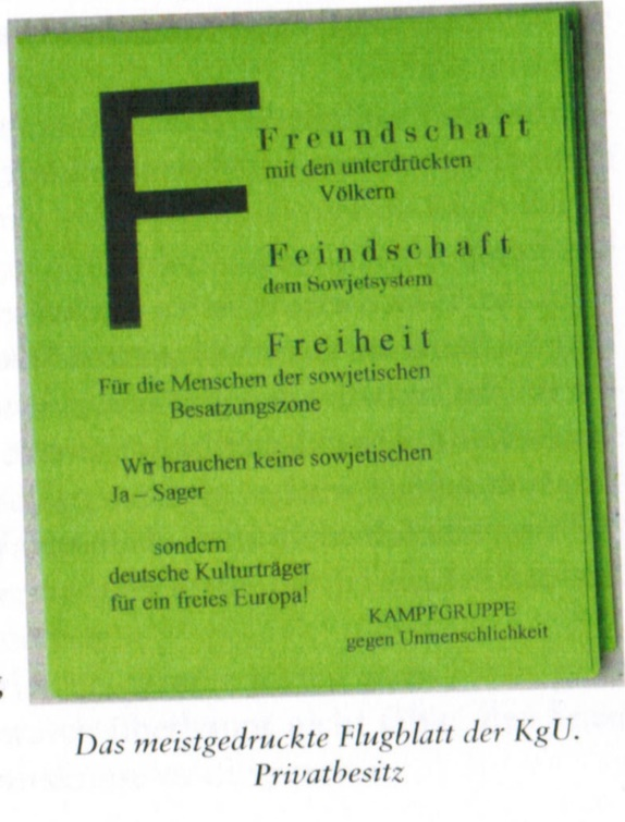 Durch ihn bin ich zur KgU gekommen, und die Leute dort, unsere Betreuer, fanden das, was wir machten, sehr gut. Mein Freund Herbert Herrmann und ich wurden Mitglieder der KgU. Wir hatten eine Geheimnummer, einen Decknamen: der eine hieß Rogge, der andere Rauch. Der Vorteil war, dass wir Propagandamaterial von der KgU bekamen – Flugblätter, Zeitschriften, Bücher – Sachen, die wir uns nicht selbst leisten oder herstellen konnten. Das haben wir nach Werder gebracht, in Briefkästen gesteckt, ausgelegt und so weiter.