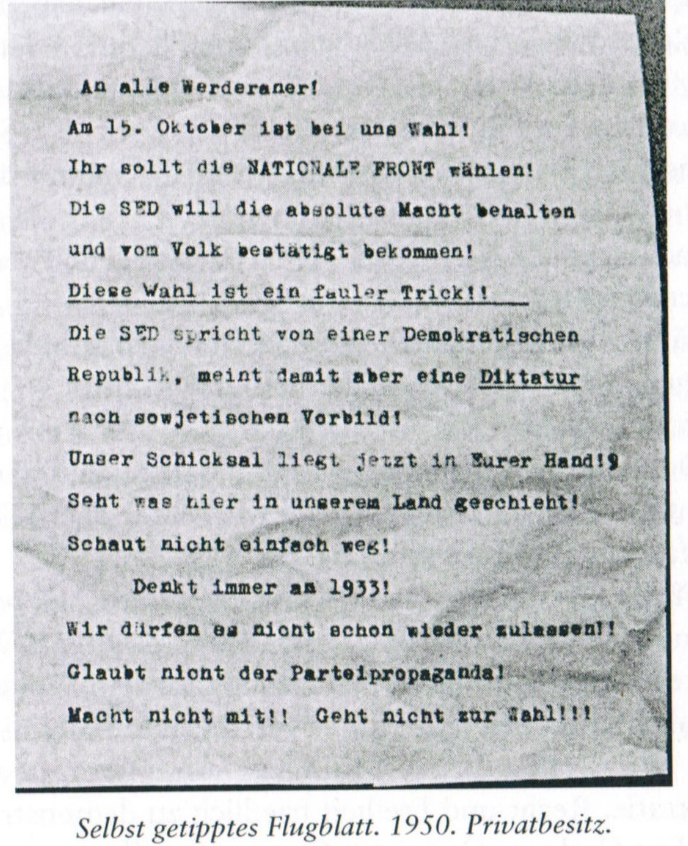 geschäftliche Korrespondenzen von ihren Arbeitsstellen an einen Kontaktmann in West-Berlin weitergegeben und zusammen mit ihrem Freund Heinz Unger Flugblätter der KgU in Werder verteilt haben.“ i