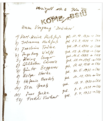 Diese Liste fand Sigurd Blümcke in den Stasiakten zum Widerstand. „SKK“ wurde hinter die Namen derjenigen vermerkt, die erschossen werden sollten. Nicht bei allen wurde das Todesurteil vollstreckt.