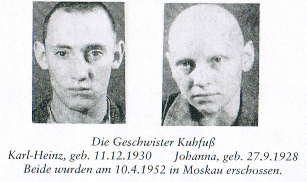 Die Bäckerei Kuhfuß ist ganz in der Nähe, Carmen- Ecke Kemnitzerstraße. Hanni arbeitet als Verkäuferin im Betrieb ihrer Eltern. Sie ist 22, ihr Bruder 20 Jahre alt. Heiner macht eine Konditorlehre im Westsektor in Berlin-Wilmersdorf. Die Geschwister bleiben verschwunden, sang & klanglos. Andere Werderaner auch. Kaum jemand traut sich, nachzufragen. Abgeholt, wie vom Erdboden verschluckt, ohne Nachricht. Angehörige durchleben Höllenqualen, Jahrzehnte Ungewißheit zwischen Hoffen & Verzweifeln, ihr Leben lang. Vater Kuhfuß hat sich erhängt, erzählt man. … Mit bzw. nach Hanni & Heiner werden fünf weitere, bis auf eine Ausnahme, junge Menschen, durch Genickschüsse in Moskau hingerichtet. Hanni wird 23 & hatte eine Adresse weitergeleitet. Heiner sammelte Unterlagen, z. B. russische Autonummern, gab diese weiter; er wird 21 Jahre alt & Mutter Kuhfuß wahnsinnig.