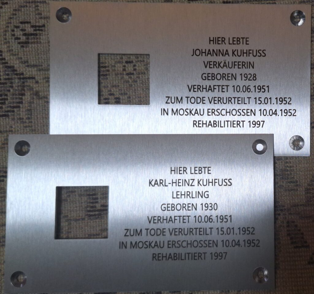 Freitag, den 21.11.2025, um 11:00 UhrCarmenstraße 1, 14542 Werder (Havel) In der Carmenstraße 1 wohnte die Konditorenfamilie Kuhfuß. Zwei ihrer Kinder, Johanna Kuhfuß (geb. 27. 9. 1928) und Karl-Heinz Kuhfuß (geb. 11. 12. 1930), wurden im Zusammenhang mit Ermittlungen gegen eine angebliche Widerstandsgruppe in Werder verhaftet. Nach Darstellung der sowjetischen Behörden soll Karl-Heinz Kennzeichen sowjetischer […]